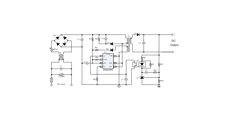 SP6600HPS在PWM模式下工作于固定頻率,這個(gè)頻率是由內(nèi)部精確設(shè)定的。在空載或者輕載時(shí),工作頻率由IC內(nèi)部調(diào)整。芯片可以工作在綠色模式,以此來減小輕載時(shí)的損耗,提高整機(jī)的工作效率,SP6600HPS在啟動和工作時(shí)只需要很小的電流,可以在啟動電路中使用一個(gè)很大的電阻,以此來進(jìn)一步減小待機(jī)時(shí)的功耗。芯片內(nèi)置有斜坡補(bǔ)償電路,當(dāng)電路工作于大占空比時(shí),避免次諧波振蕩的發(fā)生,改善系統(tǒng)的穩(wěn)定性。內(nèi)置有前沿消隱時(shí)(Leading-edge blanking time),消除緩沖網(wǎng)絡(luò)中的二極管反向恢復(fù)電流對電路的影響。SP6600HPS采用了抖頻技術(shù),能夠有效改善系統(tǒng)的EMI性能。系統(tǒng)的跳頻頻率設(shè)置在音頻(20KHz)以上,在工作時(shí)可以避免系統(tǒng)產(chǎn)生噪音。SP6600HPS內(nèi)置多種保護(hù),包括逐周期限流保護(hù)(OCP),過載保護(hù)(OLP),過壓保護(hù)(OVP),VDD過壓箝位,欠壓保護(hù)(UVLO),過溫保護(hù)(OTP)等,通過內(nèi)部的圖騰柱驅(qū)動結(jié)構(gòu)可以更好的改善系統(tǒng)的EMI特性和開關(guān)的軟啟動控制。