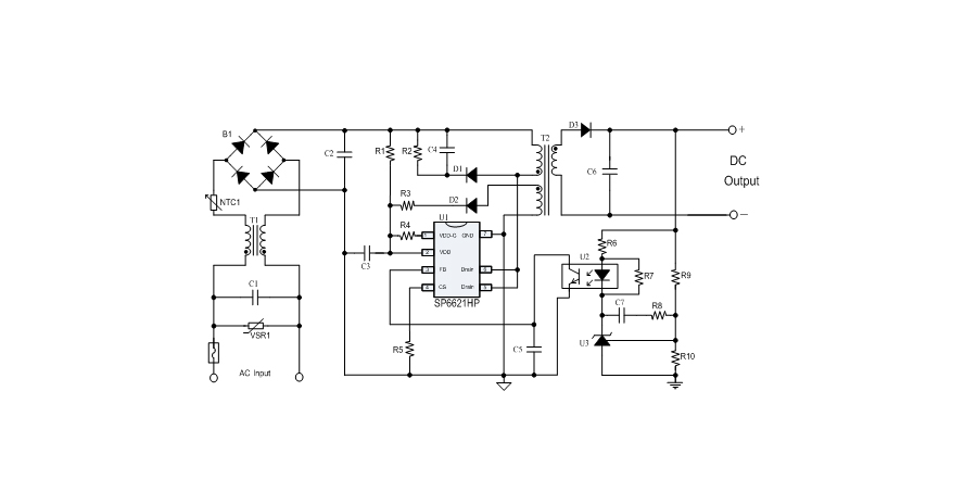 SP6621HP在PWM模式下工作于固定頻率,這個頻率是由內(nèi)部精確設(shè)定的。在空載或者輕載時,工作頻率由IC內(nèi)部調(diào)整。芯片可以工作在綠色模式,以此來減小輕載時的損耗,提高整機的工作效率,SP6621HP在啟動和工作時只需要很小的電流,可以在啟動電路中使用一個很大的電阻,以此來進一步減小待機時的功耗。芯片內(nèi)置有斜坡補償電路,當(dāng)電路工作于大占空比時,避免次諧波振蕩的發(fā)生,改善系統(tǒng)的穩(wěn)定性。內(nèi)置有前沿消隱時(Leading-edge blanking time),消除緩沖網(wǎng)絡(luò)中的二極管反向恢復(fù)電流對電路的影響。SP6621HP采用了抖頻技術(shù),能夠有效改善系統(tǒng)的EMI性能。系統(tǒng)的跳頻頻率設(shè)置在音頻(20KHz)以上,在工作時可以避免系統(tǒng)產(chǎn)生噪音。SP6621HP內(nèi)置多種保護,包括逐周期限流保護(OCP),過載保護(OLP),過壓保護(OVP),VDD過壓箝位,欠壓保護(UVLO),過溫保護(OTP)等,通過內(nèi)部的圖騰柱驅(qū)動結(jié)構(gòu)可以更好的改善系統(tǒng)的EMI特性和開關(guān)的軟啟動控制。SP6621HP使用DIP7無鉛封裝。