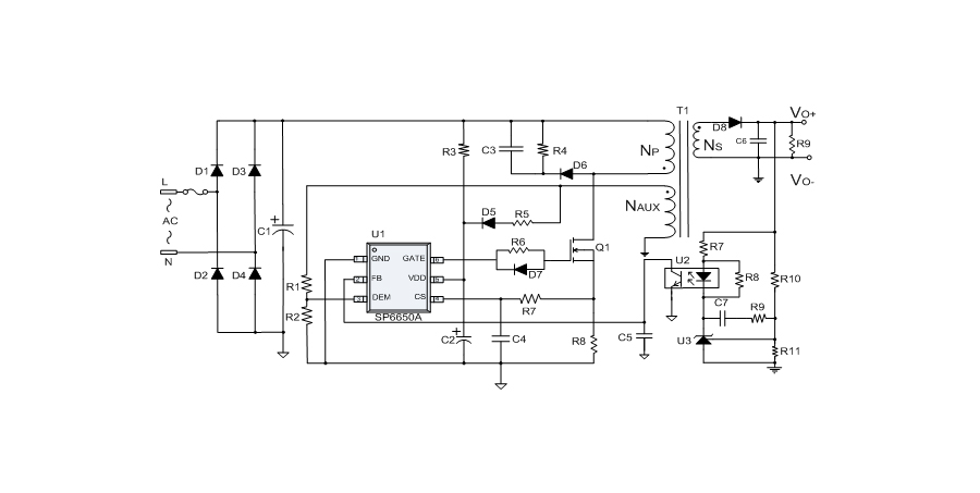SP6650A是一顆高性能、多工作模式的PWM控制芯片。芯片可以工作在跳頻及綠色模式,以此來減小空載和輕載時的損耗,也可以工作在QR工作模式及CCM工作模式,提高整機的工作效率。SP6650A在啟動和工作時只需要很小的電流,可以在啟動電路中使用一個很大的電阻,以此來進一步減小待機時的功耗。SP6650A內(nèi)置多種保護,包括:輸入電壓過低保護(Brown-out),輸出電壓短路保護,VDD過壓保護(OVP),VDD過壓箝位,VDD欠壓保護(UVLO),過溫保護(OTP)等。