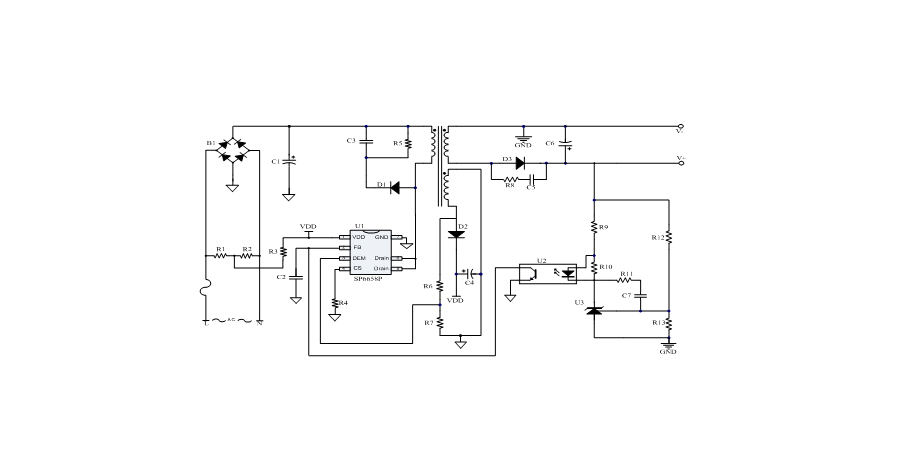 SP6658P是一顆高性能、多工作模式的PWM控制芯片。芯片可以工作在跳頻及綠色模式,以此來減小空載和輕載時(shí)的損耗,也可以工作在QR工作模式及CCM工作模式,提高整機(jī)的工作效率。SP6658P在啟動和工作時(shí)只需要很小的電流,可以在啟動電路中使用一個(gè)很大的電阻,以此來進(jìn)一步減小待機(jī)時(shí)的功耗。SP6658P內(nèi)置多種保護(hù),包括:輸入電壓過低保護(hù)(Brown-out),輸出電壓短路保護(hù),VDD過壓保護(hù)(OVP),VDD過壓箝位,VDD欠壓保護(hù)(UVLO),過溫保護(hù)(OTP)等。