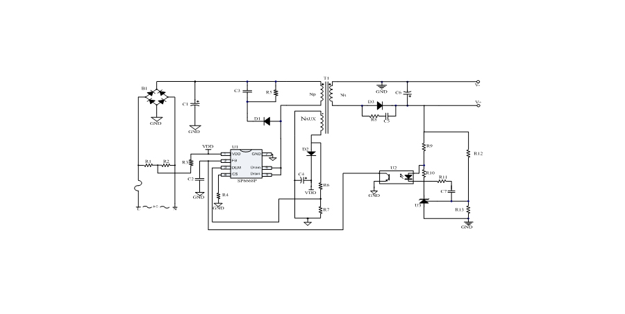 SP6668P內(nèi)置多種保護(hù),包括:輸入電壓過低保護(hù)(Brown-out),輸入電壓過高保護(hù)(Line-ovp),輸出電壓過壓保護(hù)(VO_OVP),輸出二極管短路保護(hù),逐周期過流保護(hù)(OCP),過載保護(hù)(OLP),VDD過壓保護(hù)(OVP),VDD欠壓保護(hù)(UVLO),過溫保護(hù)(OTP)等。