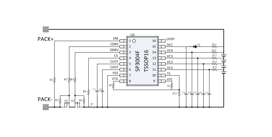 SP3004F是一款用于4串鋰電池的保護芯片,SP3004F 內部集成了高精度的電壓、電流檢測電路,能夠實現每串電池的過壓、欠壓保護,以及整串電池的充電過流、放電過流、短路保護和充放電的溫度保護等。SP3004F 內部集成 N 型MOSFET 的驅動電路,能夠直接驅動外部 N 型充電管和放電管,既可以兼容充放電分口應用,也可以兼容充放電同口應用。
