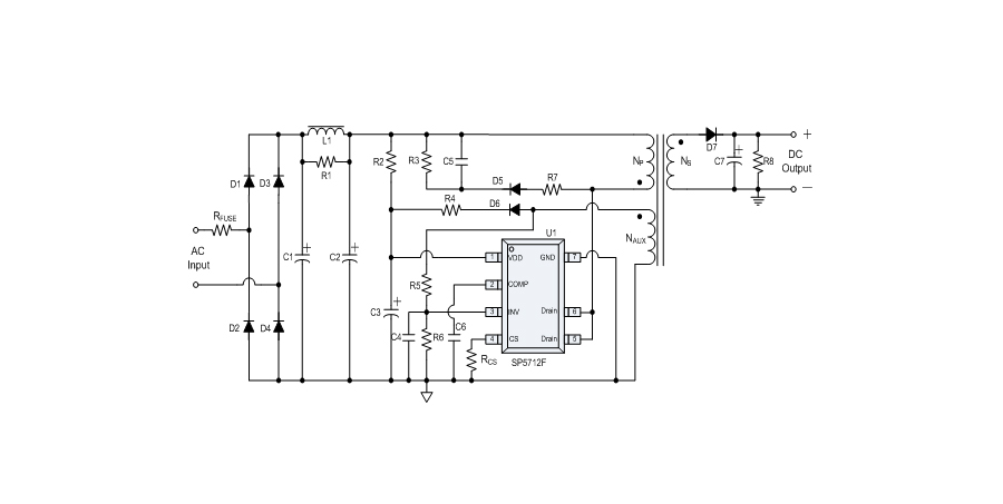 SP5712是一顆高精度離線式開關(guān)電源電路,應(yīng)用于低功耗AC/DC充電器與適配器。SP5712使用原邊取樣來進(jìn)行精確的恒流、恒壓控制,可以省去一般應(yīng)用中的光耦與TL431。