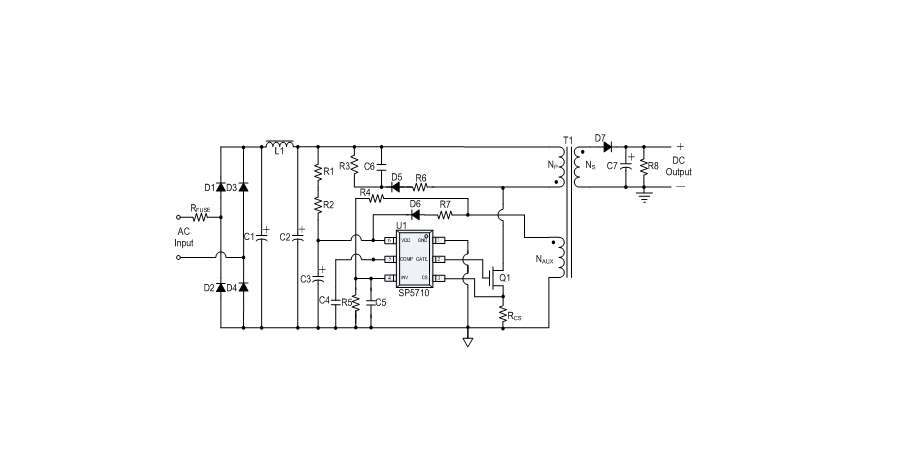 SP5710是一顆高精度離線式開關電源電路,應用于低功耗AC/DC充電器與適配器。SP5710使用原邊取樣來進行精確的恒流、恒壓控制,可以省去一般應用中的光耦與TL431。
