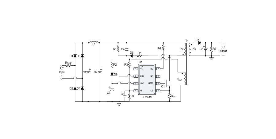 SP2731F是一款性能優異的原邊反饋控制電路,應用于中、小功率AC/DC充電器與適配器。控制電路使用原邊采樣技術進行精確的恒流、恒壓控制,可以省去一般應用中的光耦與TL431。