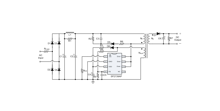 SP2739AP是一款性能優(yōu)異的原邊反饋控制電路,應(yīng)用于中、小功率AC/DC充電器與適配器。控制電路使用原邊采樣技術(shù)進(jìn)行精確的恒流、恒壓控制,可以省去一般應(yīng)用中的光耦與TL431。